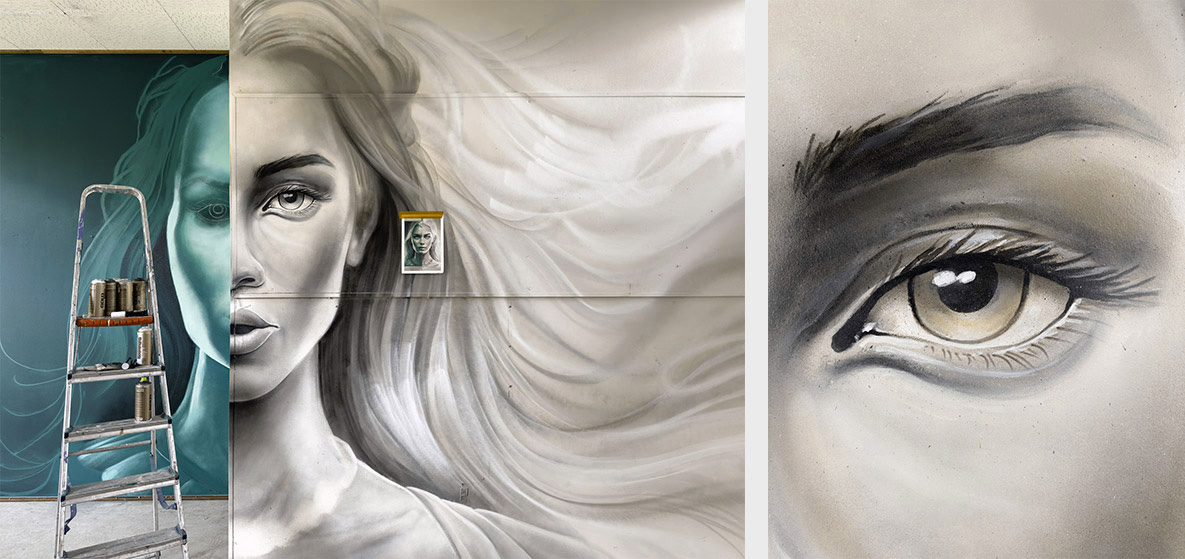 On the left half, the painting portrays the vibrant and fiery energy of the sun, symbolizing the powerful femininity of the woman. Meanwhile, the right half captures the mystique and elegance of the feminine essence, represented by the ethereal glow of the moon.